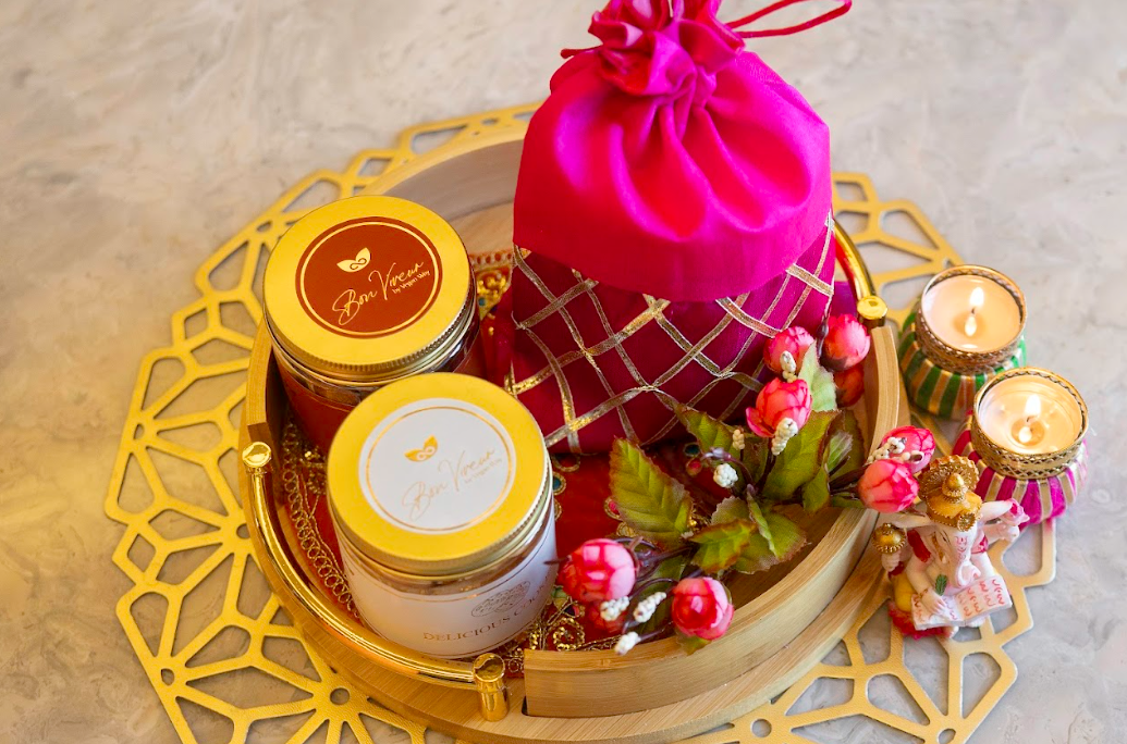 A vibrant blend of Flavoured Nuts, Gourmet Granola, and Delicious Cookies, adorned with a Diya and flowers, perfect for celebrating the festival
